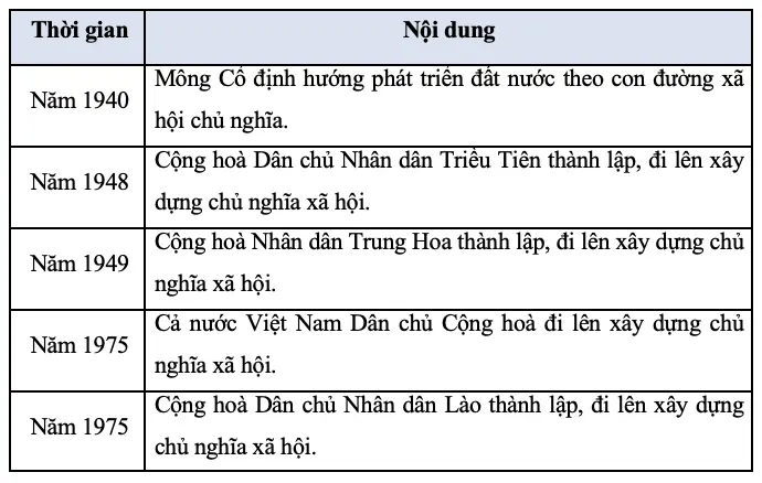 Bảng thông tin trên thống kê thời gian các quốc gia trên thế giới đi lên xây dựng chủ nghĩa xã hội