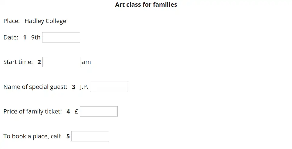 You will hear a man on the radio giving information about an art class. Listen and complete questions. (Click 'Next' to do the listening part)