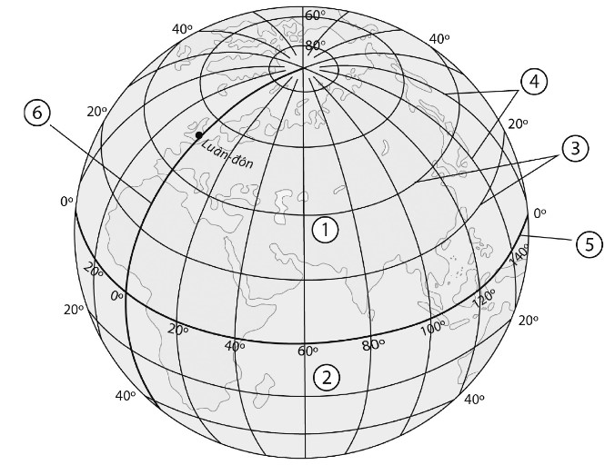 Vị trí đánh số 6 thể hiện kinh tuyến gốc
