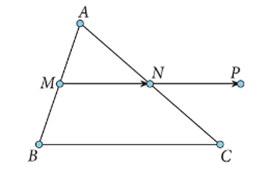 Cho tam giác \(ABC\) có \(M\) và \(N\) lần lượt là trung điểm của \(AB\) và \(AC\). Lấy điểm \(P\) đối xứng với điểm \(M\) qua \(N\). Xác định tính đúng/sai trong các khẳng định sau: