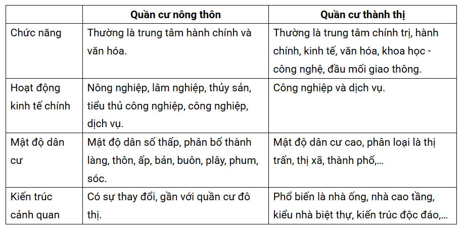 Hoàn thiện bảng so sánh sau đây về hai loại hình quần cư nông thôn và quần cư thành thị.