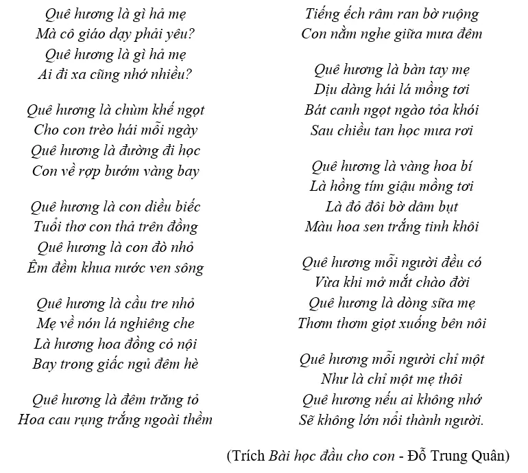 Cú pháp "Quê hương là..." được điệp lại nhiều lần trong bài thơ.