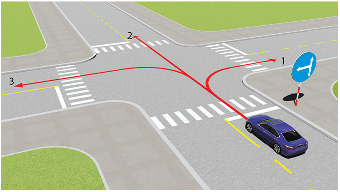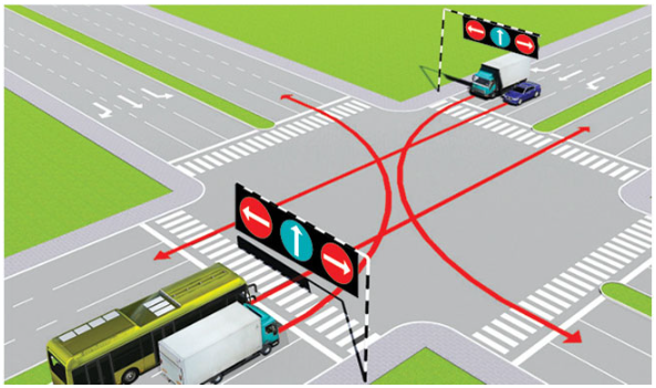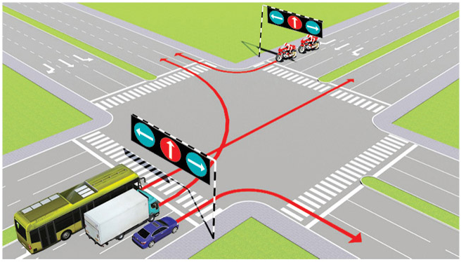 Theo Quy chuẩn kỹ thuật quốc gia về báo hiệu đường bộ QCVN 41:2019, biển báo "hướng đi phải theo" được ký hiệu là R.301a, các xe chỉ được đi thẳng (trừ xe được quyền ưu tiên theo quy định). Trong hình cả hai xe đều có tín hiệu xin nhan rẽ sang hướng khác nên cả hai xe vi phạm quy tắc giao thông.