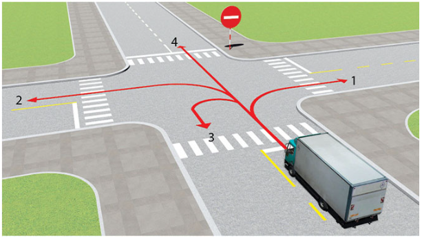 Trong tình huống này, xe tải chỉ được phép đi theo hướng 1 vì đèn xanh chỉ áp dụng cho hướng đó. Các hướng khác (2, 3, và 4) không được phép đi vì không có tín hiệu đèn xanh cho phép.