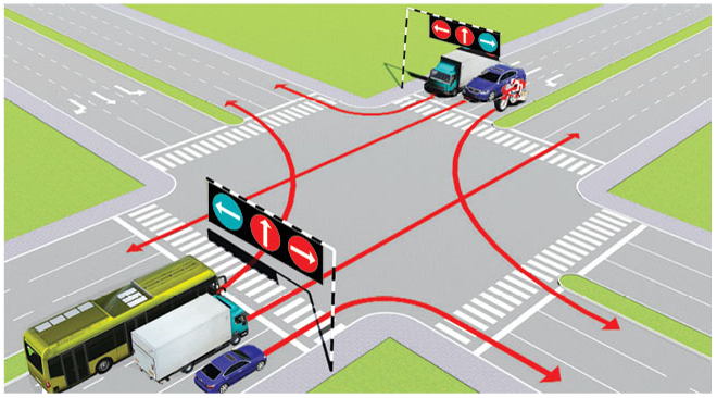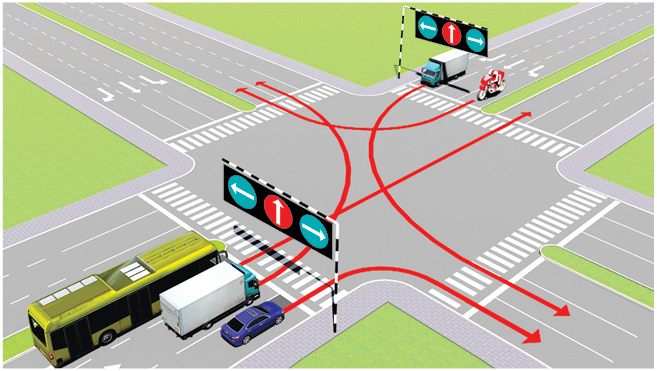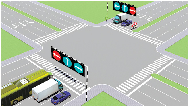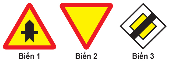Cả hai xe đều gặp biển báo “Đường ưu tiên” (hình thoi vàng) và biển “Nhường đường”.