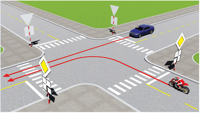 Kết luận: Xe mô tô đi trên đường ưu tiên nên được quyền đi trước.