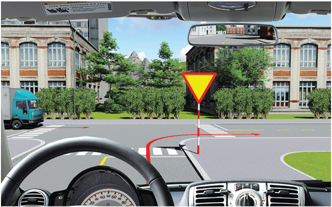 Hướng của xe con có biển “Nhường đường”, nghĩa là xe con đi trên đường không ưu tiên, phải nhường cho xe đang đi trên đường ưu tiên.